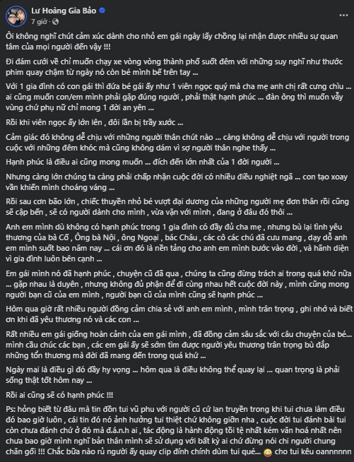 Sau dòng tâm sự xúc động nhắn gửi Cindy Lư khi em gái kết hôn cùng Đạt G, mới đây diễn viên Gia Bảo lại có chia sẻ gây chú ý. Đăng tải hình ảnh đầy đủ các thành viên trong gia đình, nam diễn viên tiếp tục nhắc đến biến cố tình cảm của Cindy Lư.